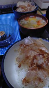 ご飯に頂いた鰹節と醤油とわさび。シンプルだけどうまい!