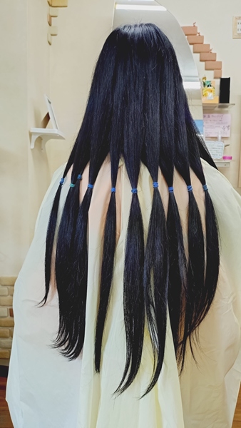 ヘアドネーション 先日に続き、本日もヘアドネーションのお客様が来られました。 こちらのお客様は数年にわたって伸ばしてこられました。 ヘアドネーションは我慢が必要ですね。 シャンプーやドライが面倒くさそうですね。よく頑張られました。 31cmで輪ゴムです。 またやりますか?