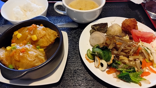 休日のランチ 連休二日目、近所のカフェでランチ。 ある時からバイキング形式になり、お野菜一杯食べれるようになりました。 ちょっと取りすぎるのがこわいです。 これで1000円。安いです。カレー風味ロールキャベツも絶品です。