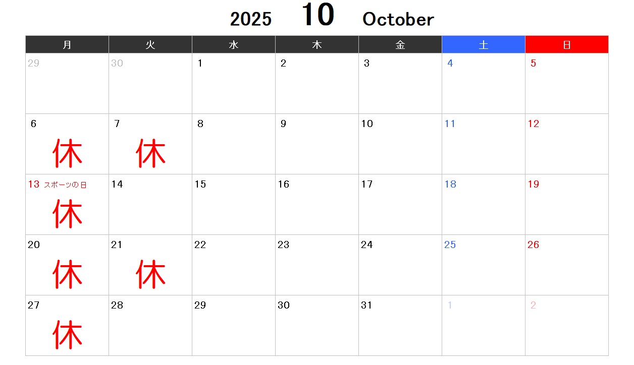 10月のお休み いつもありがとうございます。 10月のお休みをお知らせします。 ウィルでは現在年末のご予約も受け付けております。 年末は込み合う事も予想されますので、ご都合のつく方は早めのご予約をお勧めします。